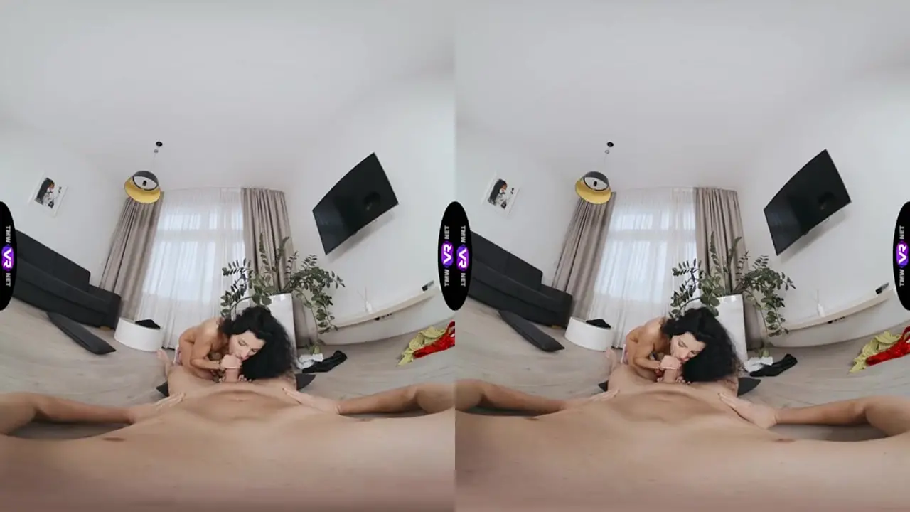 This teen couple takes their virtual reality sex session to the next level. The slender, shaved babe with natural tits is pounded in various positions - missionary, reverse cowgirl, cowgirl, and doggy style. She's dripping with cock as they both cum at the end.