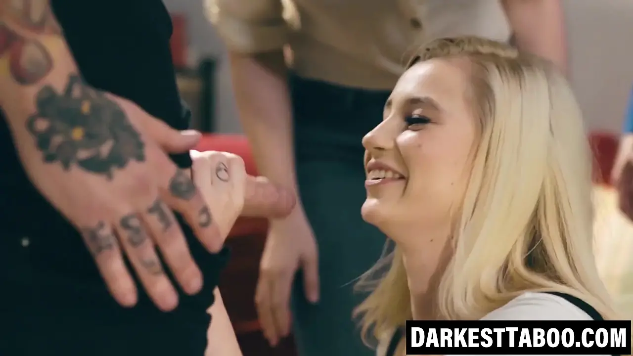 Blonde babe Carolina Sweets enjoys on her knees, begging for cum in her hungry mouth. She gives a deepthroat blowjob while her boyfriend pounds her from behind in the reverse cowgirl position. Finishing with a facial and a big tit ride, she takes his load like a true taboo teen.